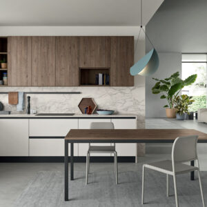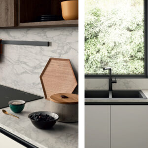Σύνθεση Κουζίνας Brillante: Ματ επιφάνειες σε αρμονία με την ζεστασιά του ξύλου και κομψότητα του μαρμάρου!