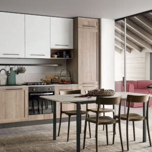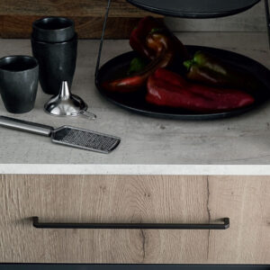 Ντουλάπια βάσης και ψηλή μονάδα effetto legno Rovere farro, ντουλάπια τοίχου lucido bianco, ανοιχτές μονάδες effetto legno rovere farro, Χειρολαβή art. 451, ανθρακί φινίρισμα.