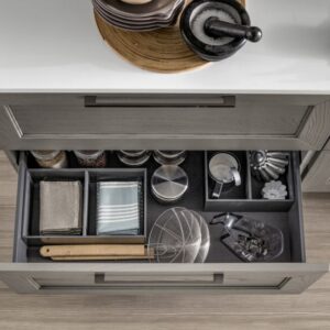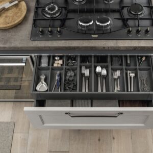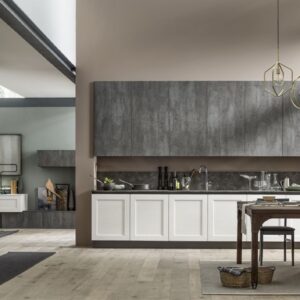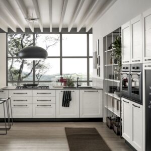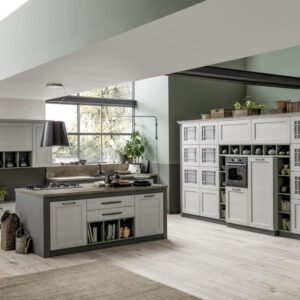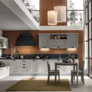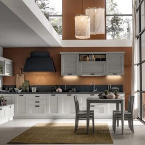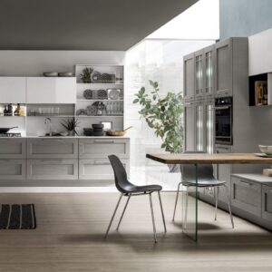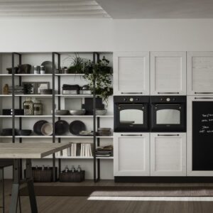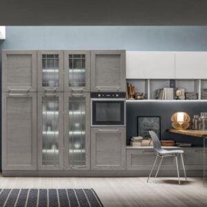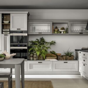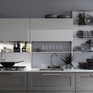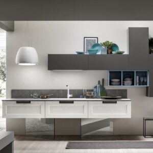 Η Σύνθεση Κουζίνας Kali διατίθεται στις ουδέτερες αποχρώσεις bianco ghiaccio, orione grigio και perla.