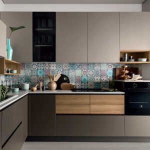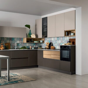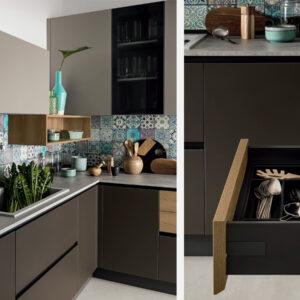 Ανακαλύψτε την διαφορετικότητα των υφών στη Σύνθεση Κουζίνας Risveglio, mat επιφάνειες συνδυάζονται άψογα με την υφή του ξύλου του τσιμέντου και του του γυαλιού.