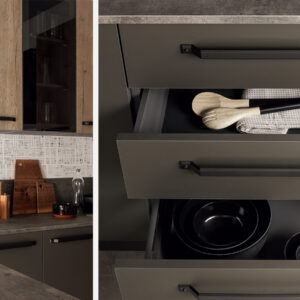 Η σύνθεση κουζίνας Sinfonia συνδυάζει άψογα διαφορετικές υφές, διαφορετικά χρώματα με λεπτομέρειες γυάλινων επιφανειών.