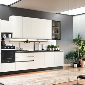 Ντουλάπια βάσης, επίτοιχες και ψηλές μονάδες colore Matt bianco, επίτοιχη μονάδα με φιμέ γυαλί στη πόρτα, ανθρακί πλαίσιο, ενσωματωμένο χερούλι.