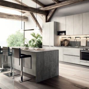 Ντουλάπια βάσης, επίτοιχα ντουλάπια και ψηλές μονάδες effetto cemento bianco,