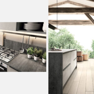 Πάγκοι εργασίας και πλευρές νησίδας από laminate HPL piombo tex 12 με μονόχρωμο σόκορο, πάχος 2 cm